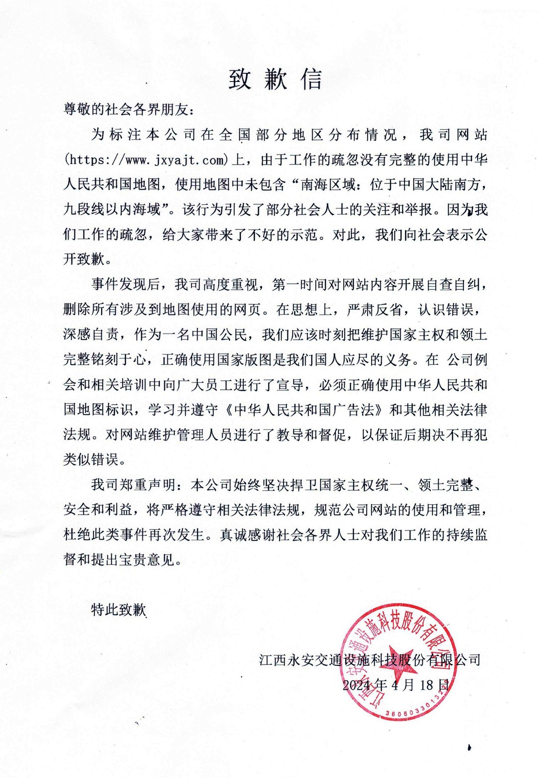 為標(biāo)注本公司在全國部分地區(qū)分布情況,我司網(wǎng)站(http://www.hmgsnsfw.cn)上,由于工作的疏忽沒有完整的使用中華人民共和國地圖,使用地圖中未包含“南海區(qū)域:位于中國大陸南方,九段線以內(nèi)海域”。該行為引發(fā)了部分社會(huì)人士的關(guān)注和舉報(bào)。因?yàn)槲覀児ぷ鞯氖韬觯o大家?guī)砹瞬缓玫氖痉丁?duì)此,我們向社會(huì)表示公開致歉。
